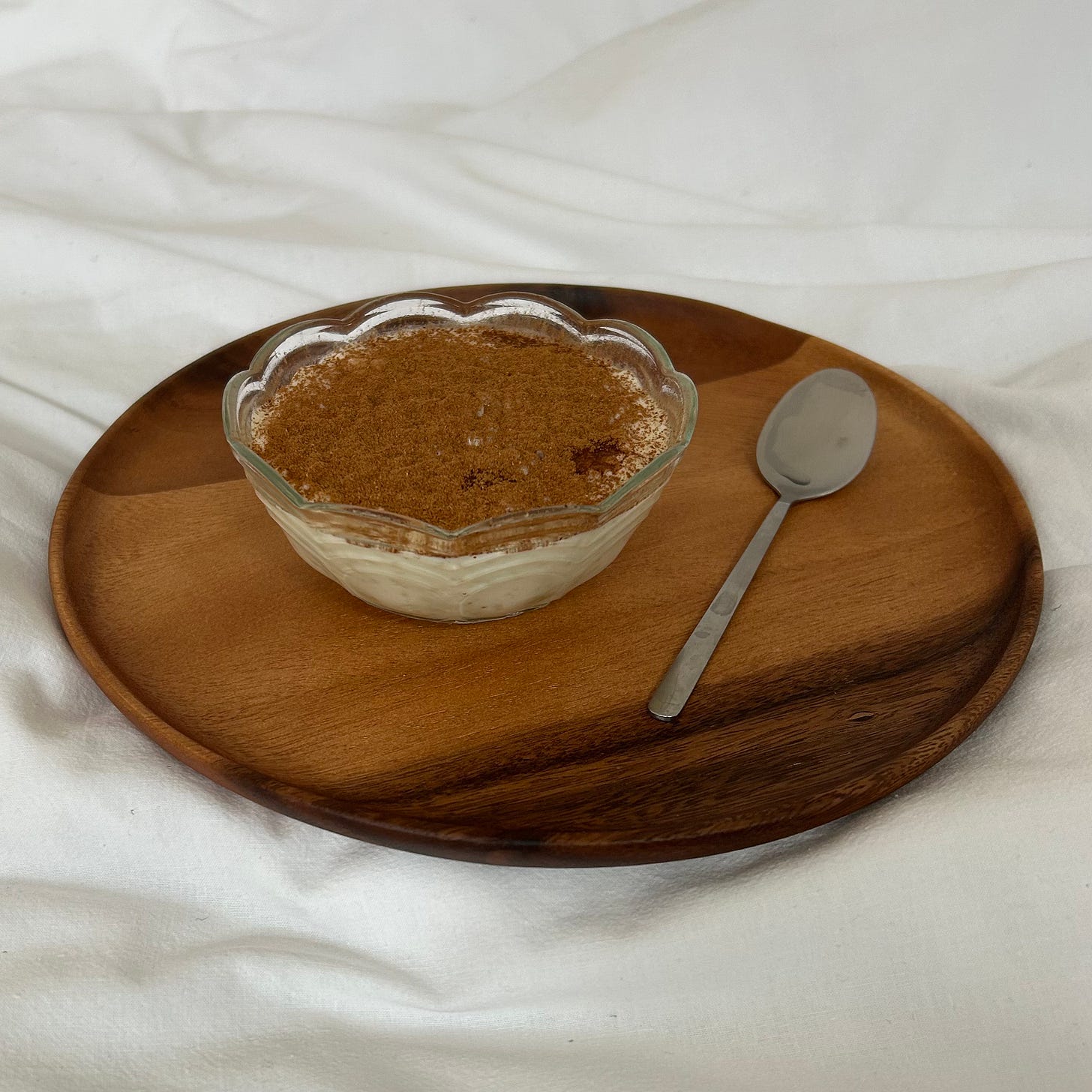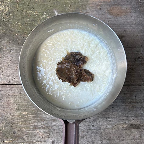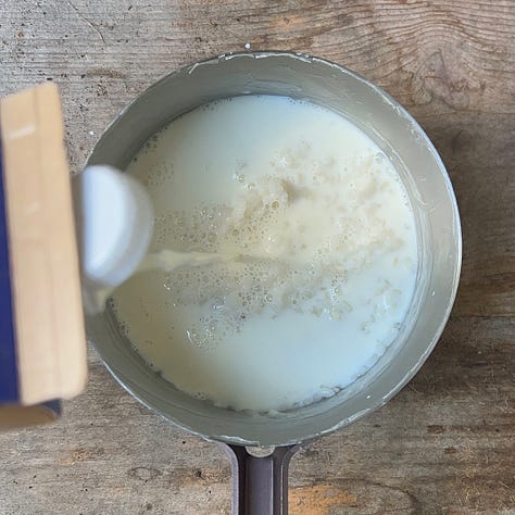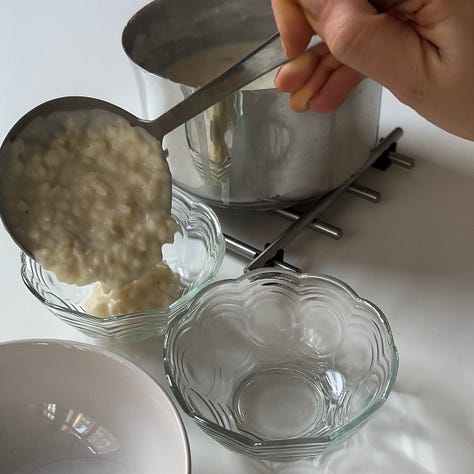 I feel lucky to be one of your 5 people audience: please don’t forget me when you’re famous. In my country (England) rice pudding is called rice pudding. It’s a very traditional dessert, often referred to as a ‘nursery food’, and you can buy it everywhere in cans branded Ambrosia (the English gods have simple tastes). If you make it at home you usually bake it in the oven to get a tasty brown crust on the top.